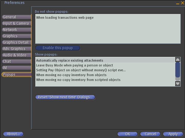 SL 1.10 preferences window - popups tab
