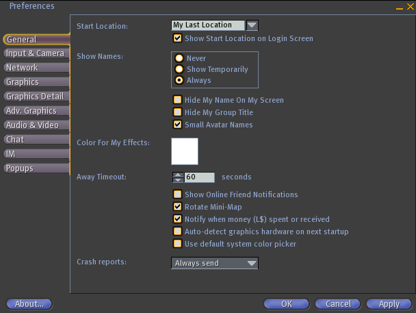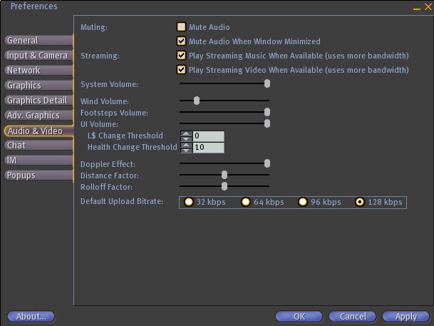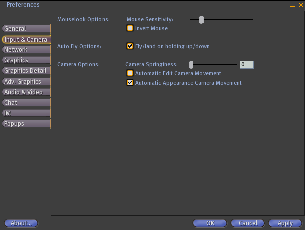 The Preferences Window is a Second Life UI element used to edit Second Life's options/properties/settings.