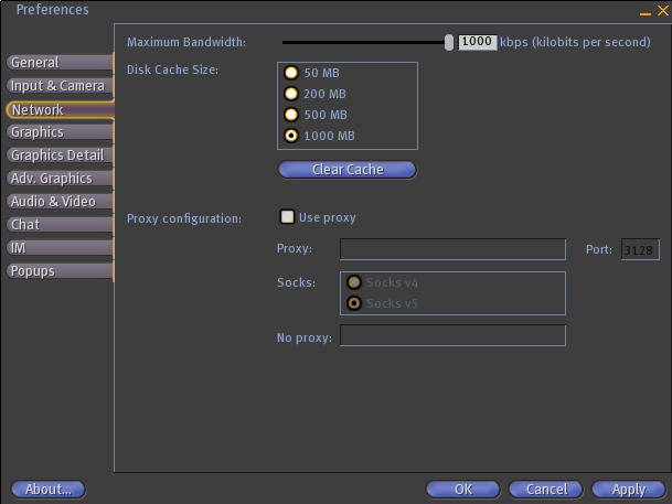 SL 1.10 preferences window - network tab