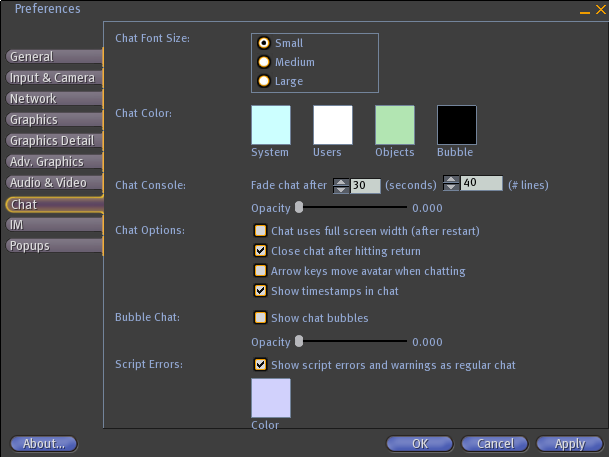 SL 1.10 preferences window - chat tab