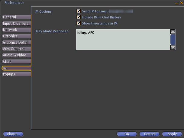 SL 1.10 preferences window - IM tab